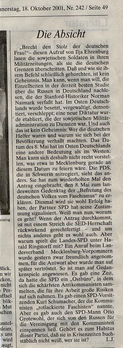 nicht bereit ist zu zensieren, Gefahren zu eliminieren oder, wie die unseren,alle, sagen "Propagandawirkungen" zu verhindern. Man müsse den Feind doch kennen, wenn man ihn bekriegt, besiegen will und wissen warum.