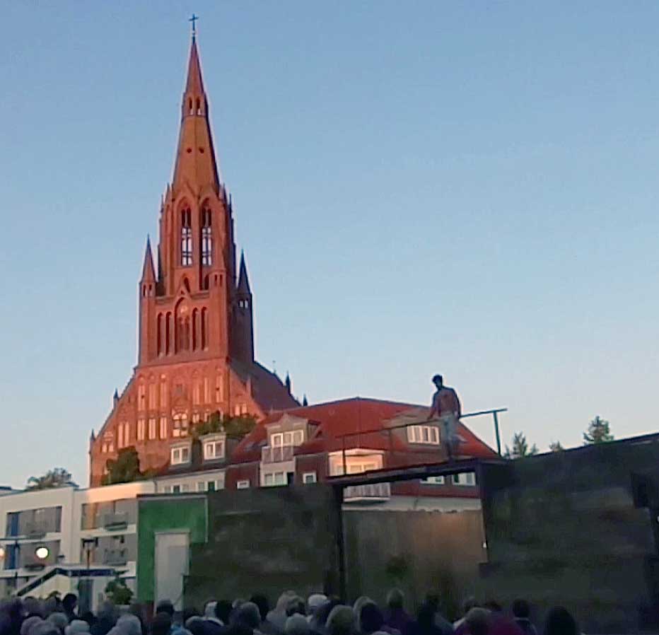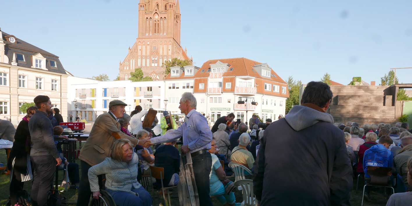 Und sie kamen in die Stadt des Untergangs im Brand von 1945, dem letzten Tag des Krieges. Und alle lachten wieder, kamen zu sitzen auf Bänken aus der Kirche und Stühlen von zuhause, auch zu erzählen und zusammen des Trinkens und Essens und auf dem Platz, sonst der Leere mit der Musik aus Wien und Linz, Demmin war wieder da.