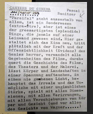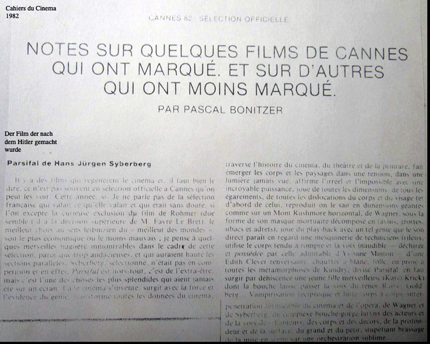 Ein Film noch in den Archiven von A. Kluge aus dem Parsifal-Studie 1982 nie gesendet, aktuell auf der Suche.