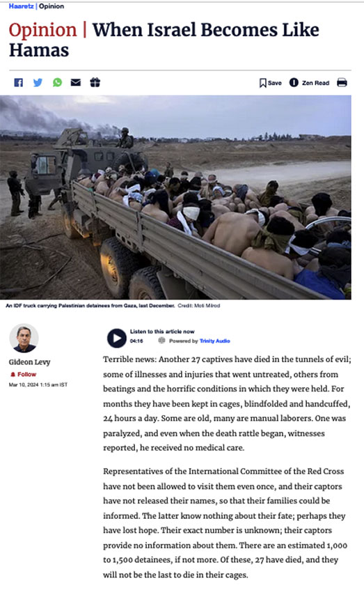 Dieser Bericht hätte auch in Israel Besorgnis über das Schicksal seiner eigenen Gefangenen aufbringen müssen. Was werden die Hamas-Jungwärter denken und tun, wenn sie hören, wie ihre Kameraden und Landsleute behandelt werden? Die Familien der Geiseln hätten die ersten sein sollen, die gegen die Behandlung der palästinensischen Gefangenen ausrufen, zumindest aus Sorge um das Schicksal ihrer Angehörigen, wenn nicht aus dem Wissen, dass ein Staat, der Gefangene so behandelt, moralische Grundlage für seine Forderungen verliert, dass seine eigenen Gefangenen in feindlichen Händen menschlich behandelt werden.