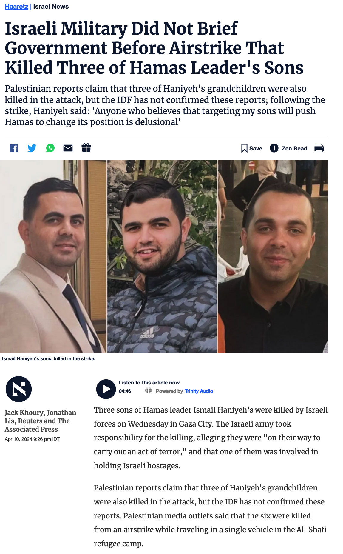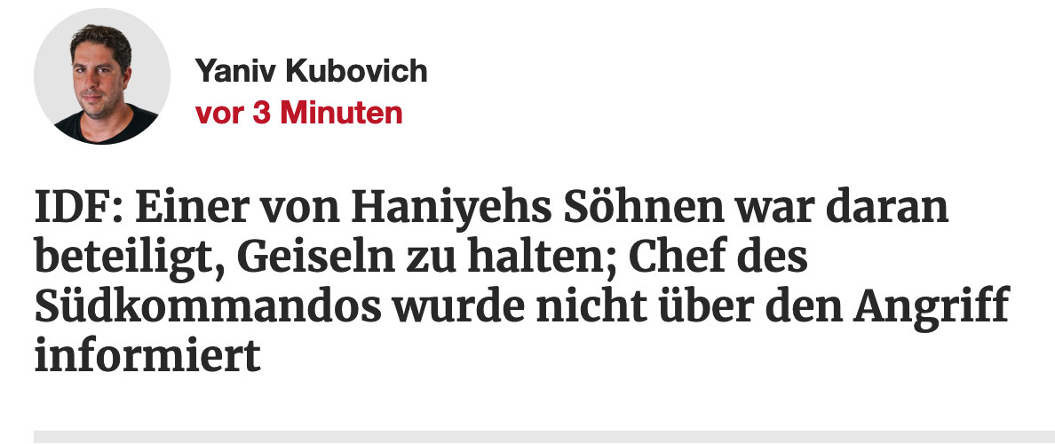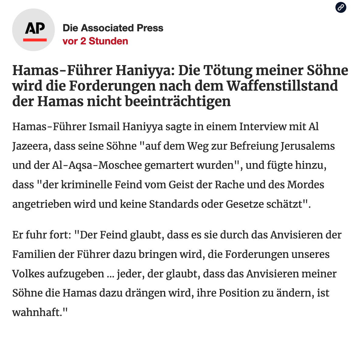 Haniyya erklärte dann, dass "die Tötung meiner Söhne die Waffenstillstandsforderungen der Hamas nicht beeinträchtigen wird", so Reuters.