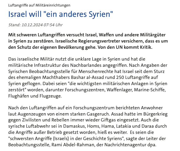 Nach Gaza Libanon, Iran nun Syrien, nach den Menschen nun das Recht sich zu verteiligen auslöschen, Töten, zerschlagen, abhängig machen, der Verantwortliche selbst gewählt vor Gericht wegen Betrug, Bestechung, Korruption, Untreue...