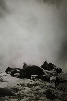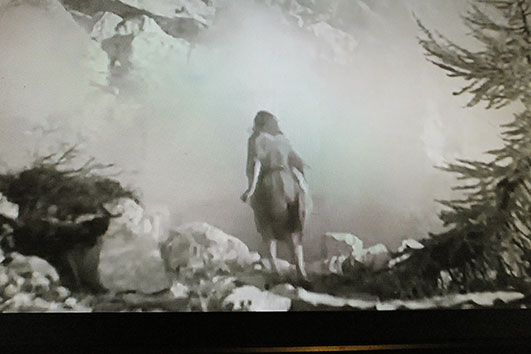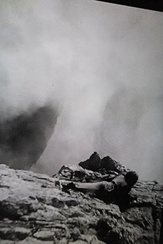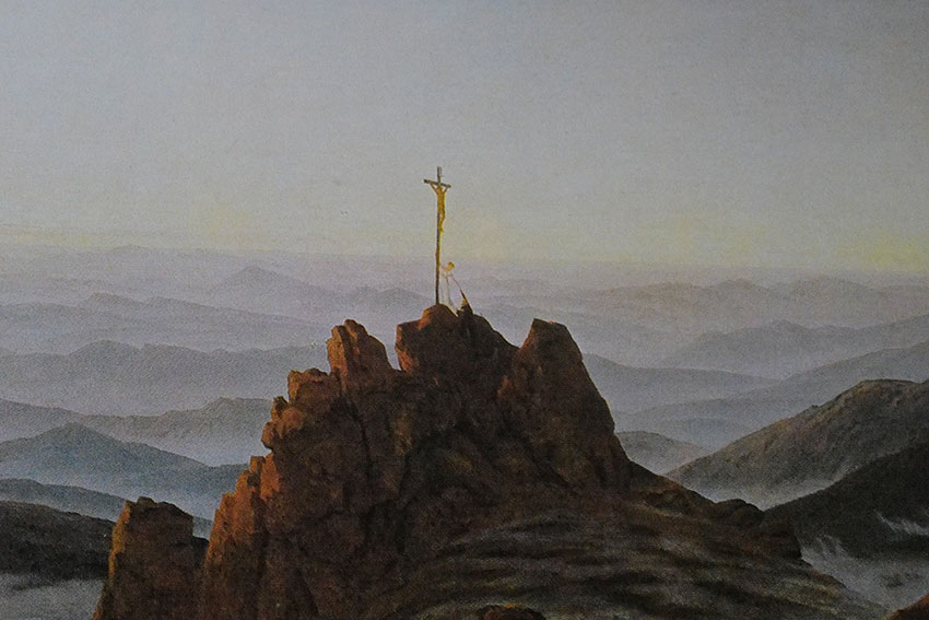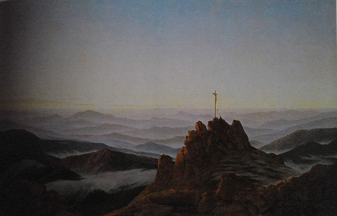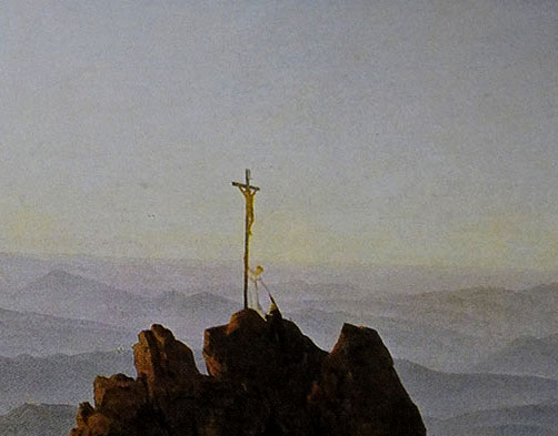 Denn was sieht man da. Auf dem Gipfel des Höchsten Berges, über dem Gefält der andern, ein Kreuz festgehalten zu Füssen eine Frau, an der ein Mann mit erhobenen Armen sich hochzieht. Nebel im Gefält. Ohne Baum in SonnenaufgangsEinsamkeiten.
