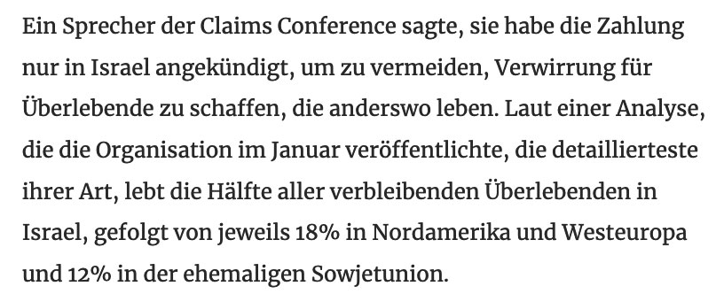 Ein Sprecher der Claims Conference sagte, sie habe die Zahlung nur in Israel angekündigt, um zu vermeiden, Verwirrung für Überlebende zu schaffen, die anderswo leben. Laut einer Analyse, die die Organisation im Januar veröffentlichte, die detaillierteste ihrer Art, lebt die Hälfte aller verbleibenden Überlebenden in Israel, gefolgt von jeweils 18% in Nordamerika und Westeuropa und 12% in der ehemaligen Sowjetunion.