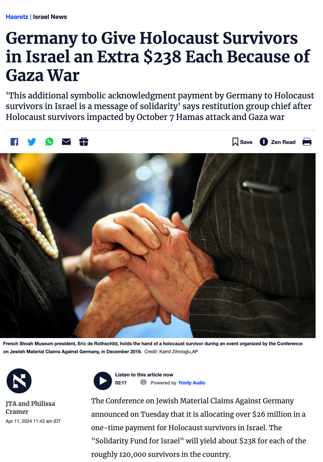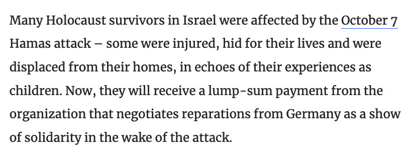 Die Zahlung folgt auf ein anderes einmaliges Stipendium, das im Dezember an israelische Überlebende gegeben wurde, die nach dem Angriff vom 7. Oktober aus ihren Häusern evakuiert wurden. Es kommt auch zu dem Gesamtbetrag hinzu, den Deutschland in diesem Jahr dazu bereit erklärt hat, Überlebenden und verwandten Organisationen zu zahlen - mehr als 1,4 Milliarden Dollar, die meisten jemals - in einer Reflexion der hohen Kosten für die Betreuung älterer Überlebender.