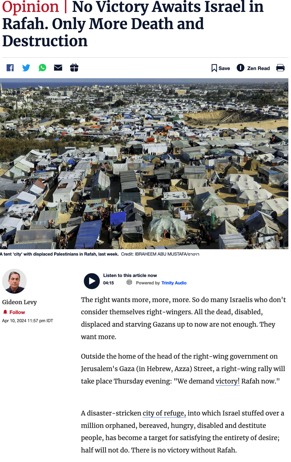 There will be no victory in this war; we knew that from the start. Maybe a miracle will occur and there will be no Gaza invasion. But the lust for Rafah is horrifying. Is it only bloodthirstiness? Hatred of Palestinians and the desire to avenge October 7?