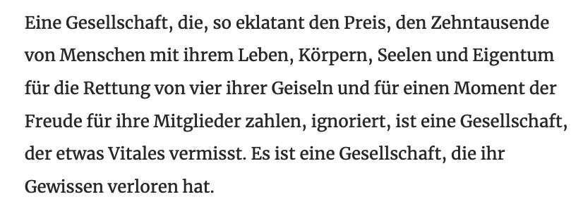 Eine Gesellschaft, die, so eklatant den Preis, den Zehntausende von Menschen mit ihrem Leben, Körpern, Seelen und Eigentum für die Rettung von vier ihrer Geiseln und für einen Moment der Freude für ihre Mitglieder zahlen, ignoriert, ist eine Gesellschaft, der etwas Vitales vermisst. Es ist eine Gesellschaft, die ihr Gewissen verloren hat.