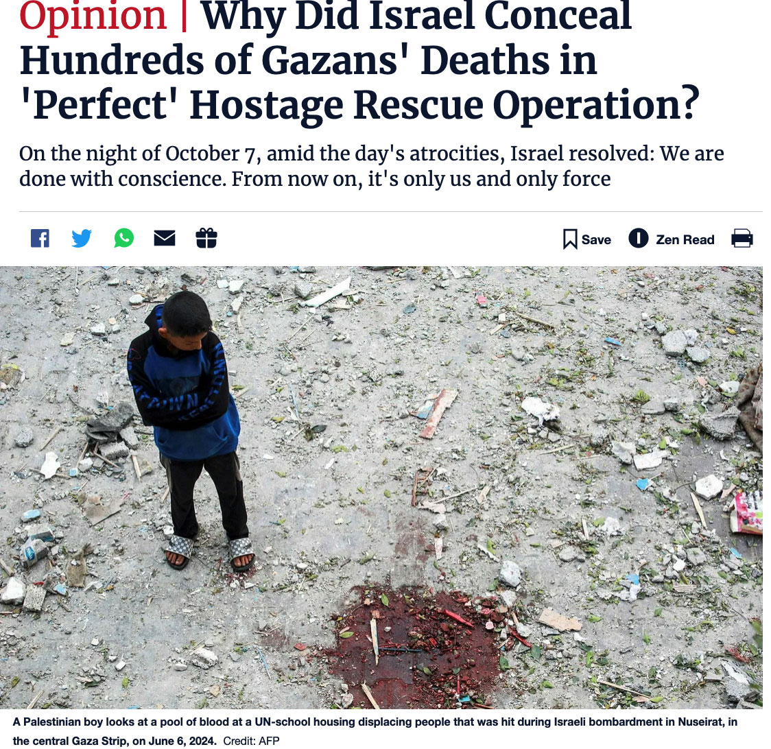 Offensichtlich hätte die bewegende Rettung gefeiert werden müssen. Die Israelis verdienen einen Moment der Freude in der Hölle, in der sie seit Monaten leben, die noch nicht vorbei ist. Aber man kann den Preis der Palästinenser nicht ignorieren, auch wenn es Leute gibt, die glauben, dass der Preis unvermeidbar oder sogar völlig gerechtfertigt war.