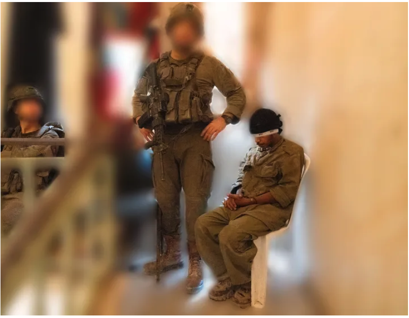 Bevor der Palästinenser mit Augenbinde und israelischer Uniform in den Tunnel geschickt wird als Schutzschild für die Befreiung der Zivilisation der Welt von den Untermenschen in Gaza. Befreiung ohne Gesicht.