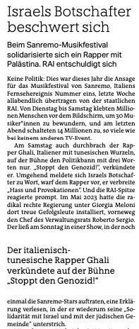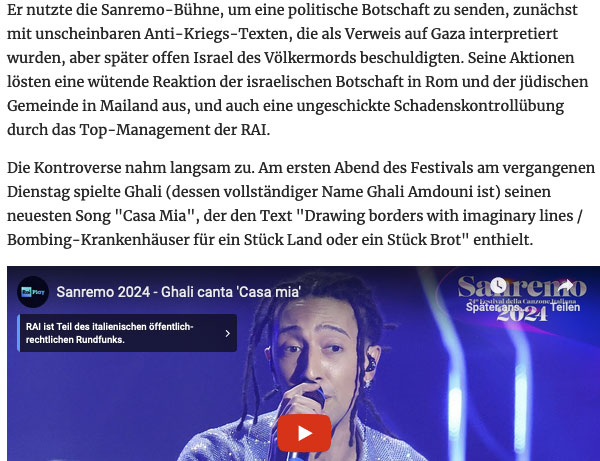 "Es war wie eine Bombe auf Sanremo, die von außerhalb von Sanremo kam", sagte Marta Cagnola, eine Reporterin, die über das Festival für Radio24 berichtete. "Als Ghali zum ersten Mal 'Casa Mia' sang, erwartete keiner von uns in der Presse eine größere Kontroverse. Es war eher so, als würde er eine potenziell universalistische Botschaft ausdrückten. Dann explodierte es."