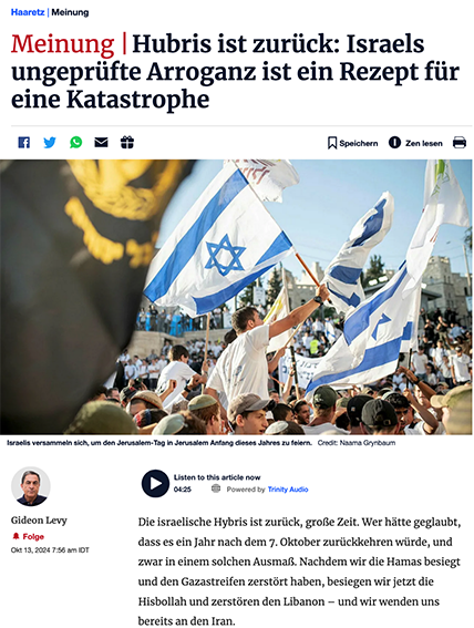 Die israelische Hybris ist zurück, große Zeit. Wer hätte geglaubt, dass es ein Jahr nach dem 7. Oktober zurückkehren würde, und zwar in einem solchen Ausmaß. Nachdem wir die Hamas besiegt und den Gazastreifen zerstört haben, besiegen wir jetzt die Hisbollah und zerstören den Libanon – und wir wenden uns bereits an den Iran.