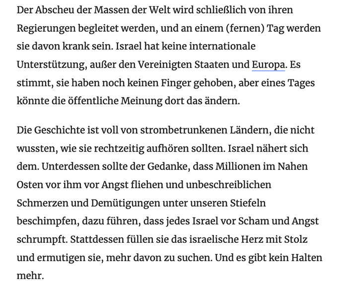 Der Abscheu der Massen der Welt wird schließlich von ihren Regierungen begleitet werden, und an einem (fernen) Tag werden sie davon krank sein. Israel hat keine internationale Unterstützung, außer den Vereinigten Staaten und Europa. Es stimmt, sie haben noch keinen Finger gehoben, aber eines Tages könnte die öffentliche Meinung dort das ändern.