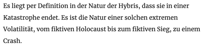 Es liegt per Definition in der Natur der Hybris, dass sie in einer Katastrophe endet. Es ist die Natur einer solchen extremen Volatilität, vom fiktiven Holocaust bis zum fiktiven Sieg, zu einem Crash.