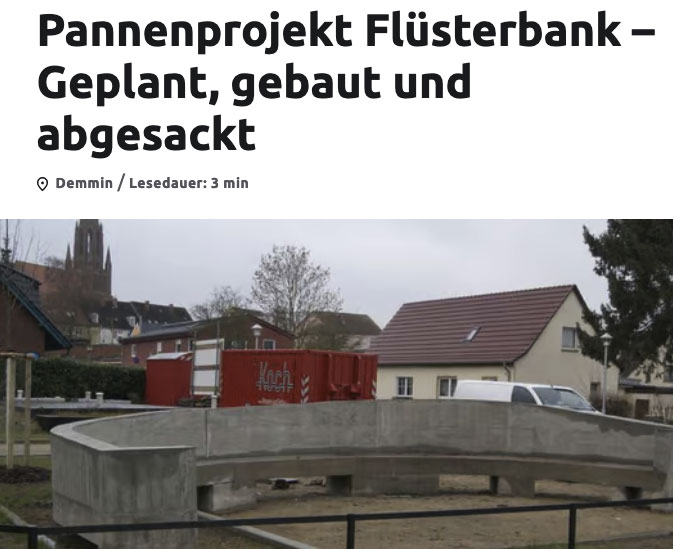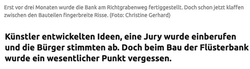 Eine Bank zum Gegenstand eines Wettbewerbs geworden und nach der Prämiereung von der Lokalzeitung und dem lokalen Fernsehen zum Thema geworden, als Scheitern einer forcierten Sinnhaftigkeit in zufälligem Umfeld.