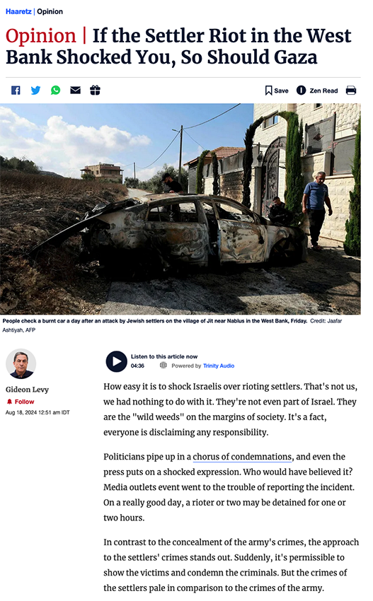 Wie einfach ist es, die Israelis über randalierende Siedler zu schockieren. Das sind nicht wir, wir hatten nichts damit zu tun. Sie sind nicht einmal Teil Israels. Sie sind das "wilde Unkraut" am Rande der Gesellschaft. Es ist eine Tatsache, jeder lehnt jede Verantwortung ab.