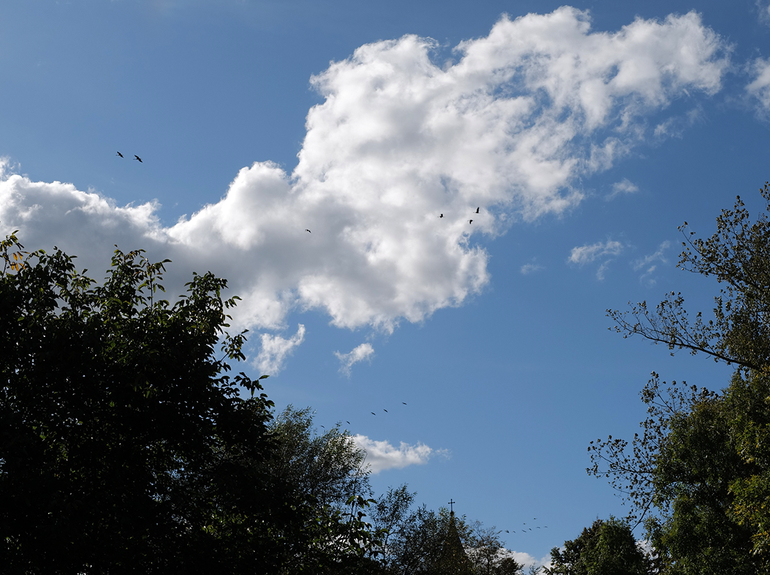 Und die Bewohner der Lüfte als Kraniche von N. sagens uns . Schreiend ziehen sie ihre Bahnen von den Feldern zum Fluss und zurück. hunderte.