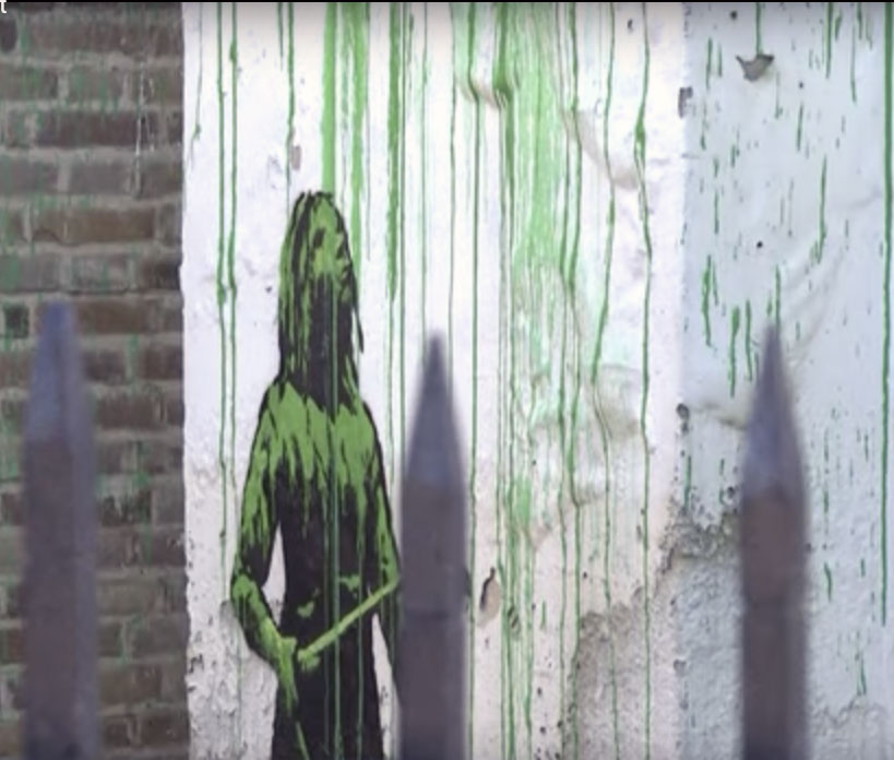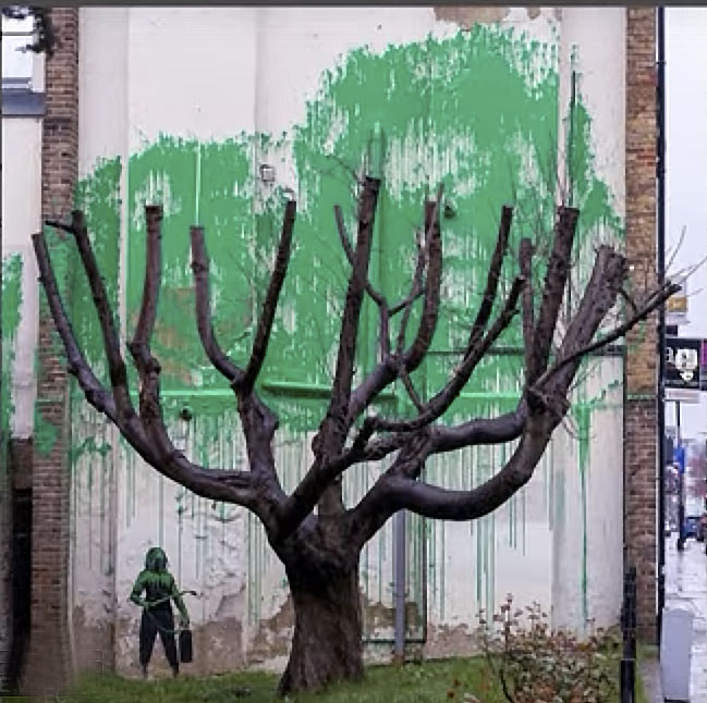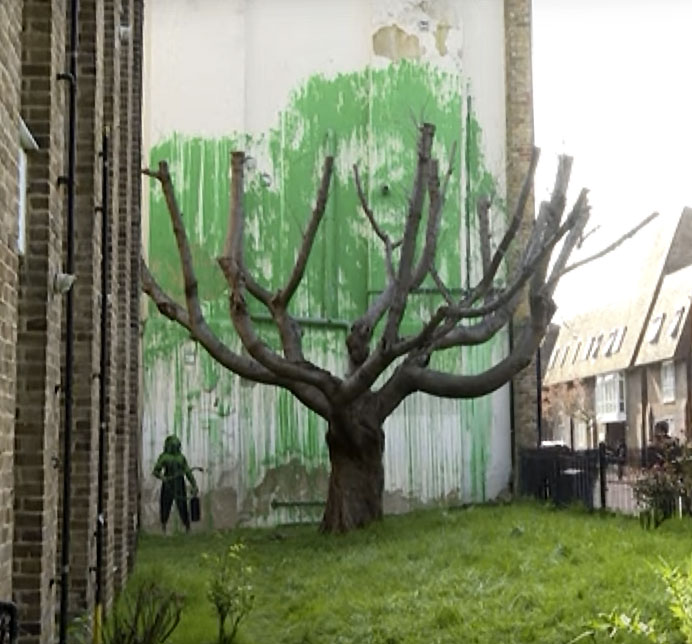 in London an der Wand des Hauses dahinter. Und nimmt eine mit Spritzpistole selbst vom Grün bekleckert Mass zu nehmen an kahlen und beschnittenen Ästen.