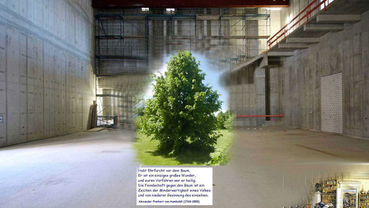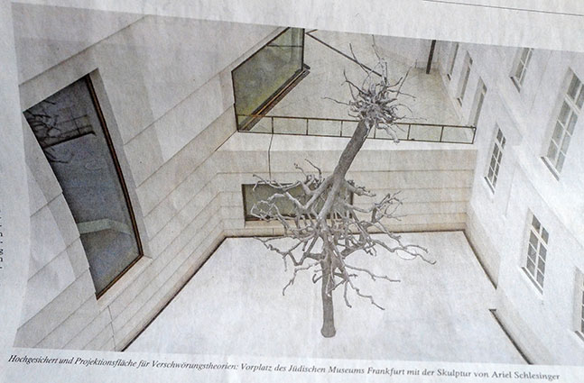 Oben im Jüdischen Museum Frankfurts ist der Baum in einer artifiziellen Fassung zu sehen im Hof. Warum nicht in Berlin, im wieder entstandenen Schloss mit historischer Maske . Im Namen Humboldts, den sie ihm gegeben. Und Kamera darauf live ins Land zu senden, seine Botschaft.