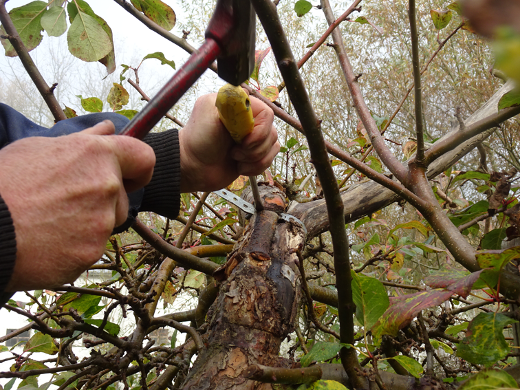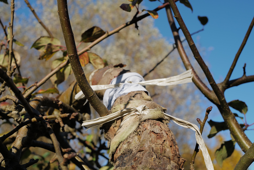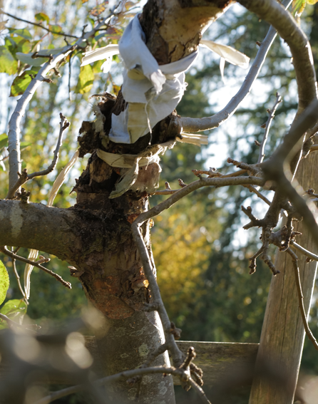 tief haben sich die haltenden Eisenbänder in den Stamm des Baums eingewachsen