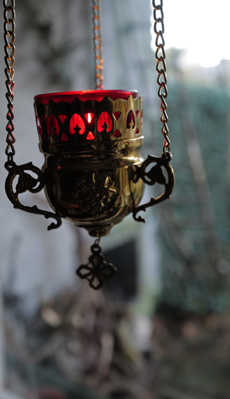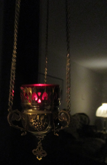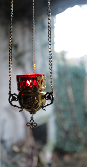 Die alte russiche Lampe wird bedacht. Öl fasst sie nicht mehr. Eine Ruine der letzten Explosion. Not dürftig als Form des Erinnerns wieder hergestellt.