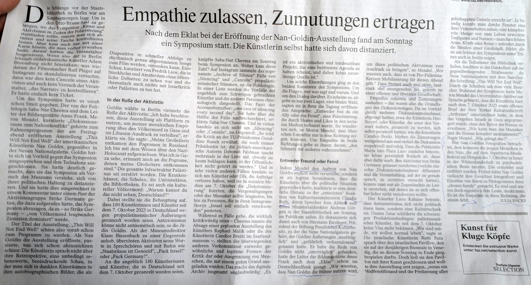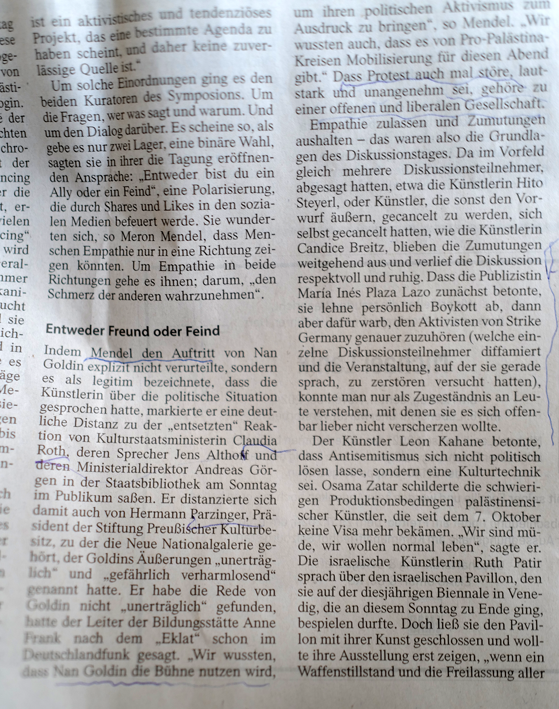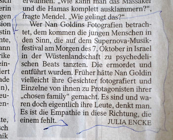 Zu wissen, wo hier nun wir und sie -NG- hingehören, wenn sie weiterging auf ihrem Weg der finalen Stationen menschlicher Existenzen. Und niemand der ihre neuen Bilder vermisst, sie abfragt, sie zeigen wollte, von denen die so wohlfeil da reden? aus dem Slams in Gaza aus der Hölle täglich rundum, mit den Fragen durch wen, und was . - Die da schreien toben, wissen das, wollen nicht reden. Wenn wir sehen wie hungern frieren ertinken, und das ist so gewollt. Als Endlöung der Palestina Frage. Endlich schreien sie - in Deutschland: Nein.