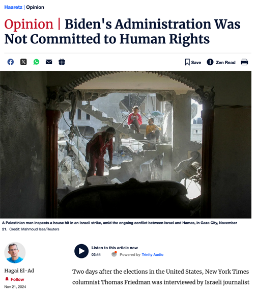 Friedman is a prize-winning commentator who is close to U.S. President Joe Biden and sometimes serves as his (un)official voice. Dayan is one of the journalists held in the highest esteem in Israel. And yet, they both exchanged words that can only be described as bullshit, and it was seen as a reasonable interview between two good, liberal journalists who support democracy and don't support bad figures like Netanyahu or Trump.
