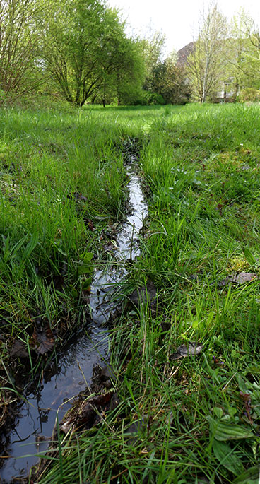 Von den nassen Wiesen in den Humus der Bäume das Rinnsal führen hinab in das Wasserloch anstelle des Grabens.
