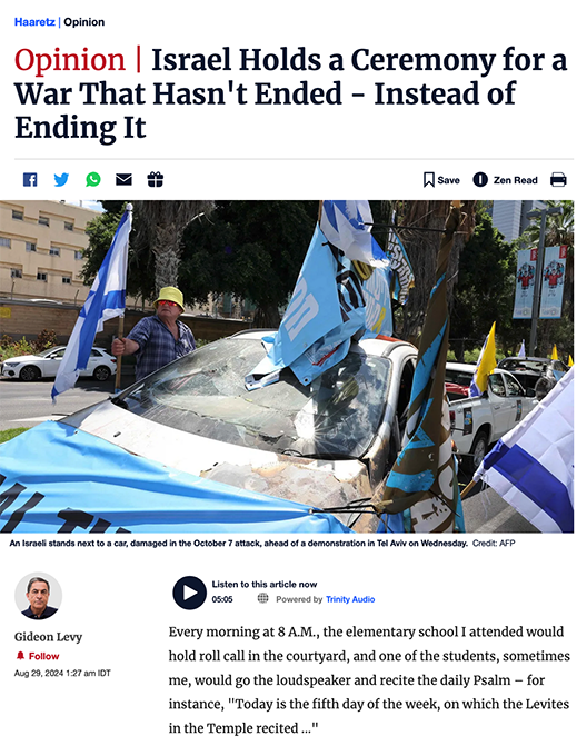 Für die Familien, die um Trauer kommen, ist die Trauer noch auf dem Höhepunkt. Alle anderen Israelis sind mit ihrem Leben beschäftigt. Und Verzweiflung herrscht über alle. Was tun wir also? Wir ignorieren alles und ziehen wegen einer Zeremonie in den Krieg. Wenn es nicht so traurig wäre, wäre es lustig, grotesk, eine Komödie, die von Hanoch Levin hätte geschrieben werden können.