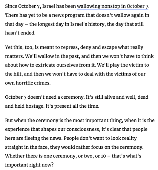 Der 7. Oktober braucht keine Zeremonie. Es ist immer noch lebendig und gesund, tot und als Geisel gehalten. Es ist die ganze Zeit präsent.