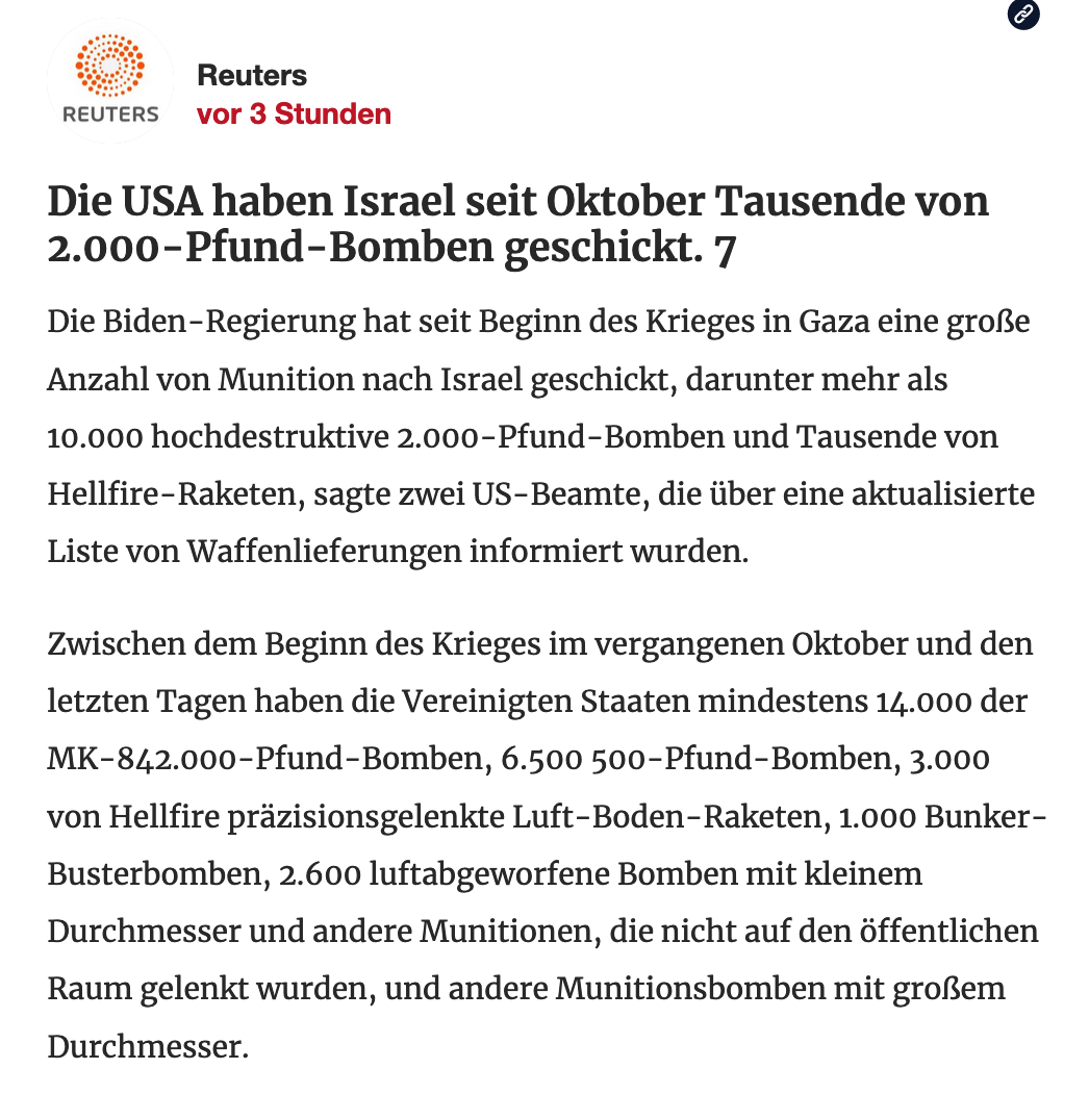 Wie zwei mit der Angelegenheit vertraute Personen, die über eine aktualisierte Liste der Waffenlieferungen informiert wurden, berichteten, haben die USA im Detail zwischen Oktober 2023 und den vergangenen Tagen neben den MK-84-Bomben auch 6.500 500-Pfund-Bomben, 3.000 präzisionsgelenkte Hellfire-Raketen, 1.000 Bunkerbrecherbomben und andere Munition geliefert. Die Lieferungen sind nach Angaben der Insider Teil einer größeren Liste von Waffen, die seit Beginn des Konflikts nach Israel geliefert wurden.