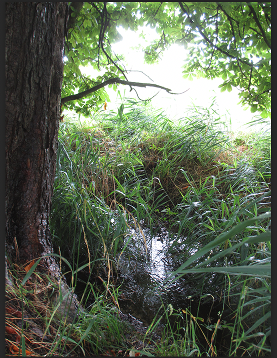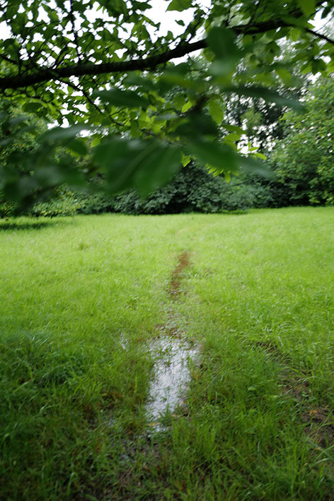 Nach den Wolkenbrüchen der letzten Nacht fliesst das Wasser am Ende des Rohrs freudig und wild ohne Bedarf irgendwelcher regelnden Eingriffe munter aufs Feld.