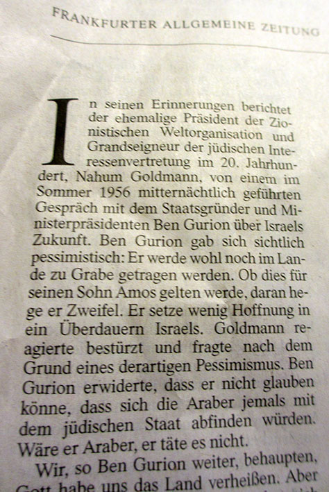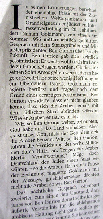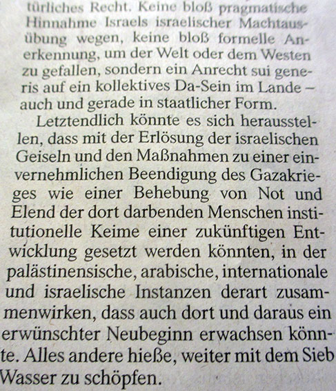 Wenn nämlich Deutschland damit zu tun hat, wie es hat, an der Gründung dieses "Israel" genannten Gebildes, hat es sich zu kümmern, und seine "Staatsraison" denen zuzuwenden, auf deren Kosten dies entstand, und das ist schon aus Klugheit geschehen, das man dort ruhig ist: Palestina und den Palestinensern. Mit Geld, was man auch tat, aber auch mit öffentlicher Sorge und Bekenntnis, diplomatisch, politisch und medial. Diese Fehlleistung gegen Über Israel, wie es heute sich zeigt, machte uns fett, und wo wir heute sind, nicht herzlich, mit Folgen in unserem unguten Befinden zur Zeit. Da helfen auch keine Versammlungen auf den Strassen und Märkten. Mit Angst vor nächsten Wahlen. Und schlechte Bilanzen der Kassen ohne Einsicht warum.