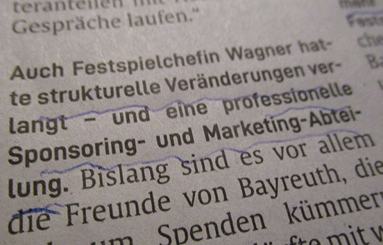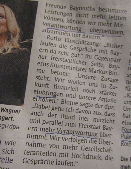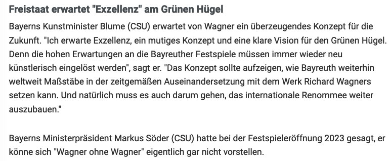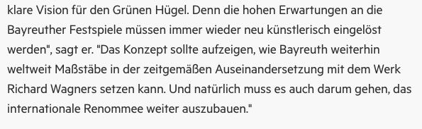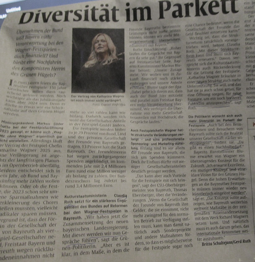 Die Zeitungen und Medien sind voll davon. Bayreuth, gegründet von R. Wagner vor fast 150 Jahren gegen den Betrieb der Theater seiner Zeit, und das hiess gegen das was sie spielten, wie sie es taten und aus dem sie es beschrieben. Das soll nun zurückgeholt werden, um die Realität unserer Gesellschaft stärker wiederzuspiegeln, Diversität(buntes)ist gefordert, als Nachholbedarf, und das künstlisch einzulösen in neuen Formaten, einer Strukturreform, um ein internationales Renomee weiter auszubauen, daraus Weltmasstäbe zu setzen.