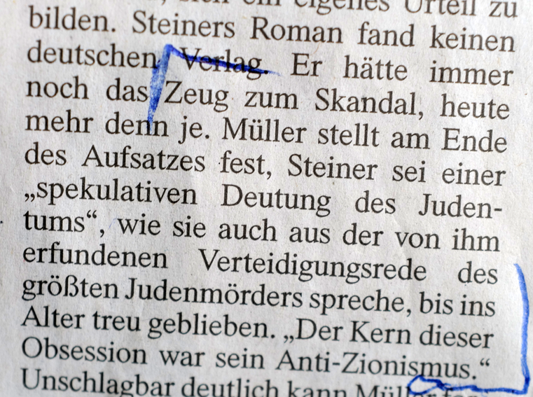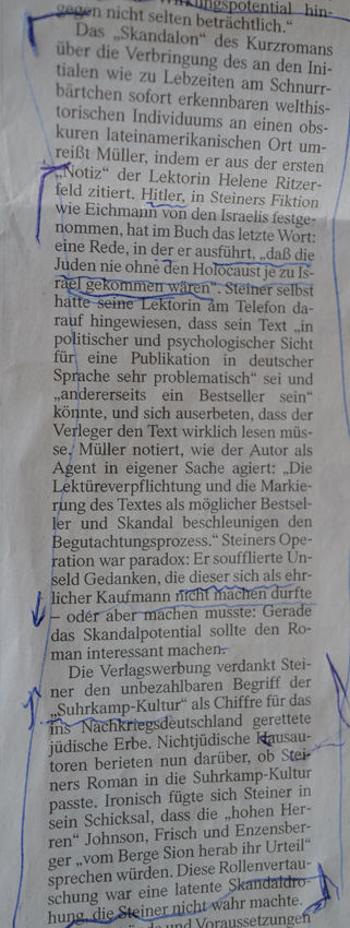 über den vor Jahrzehnten nicht veröffentlichen Roman des Verlagsautoren von Suhrkamp Gerorg Steiner. Er durfte nicht konkurrieren mit den anderen dieser "Suhrkampkultur" und war doch der Beste. Wir liessen der Hitler aus dem Grab steigen und Dinge sagen, wie sonst nicht, dies aber in dem Film nicht, denn er kam ja aus Deutschland. Denn was hiesse das für die damalige und noch mehr heutige Realität anderes, als alles anders zu machen als es jetzt geschieht - von allen.