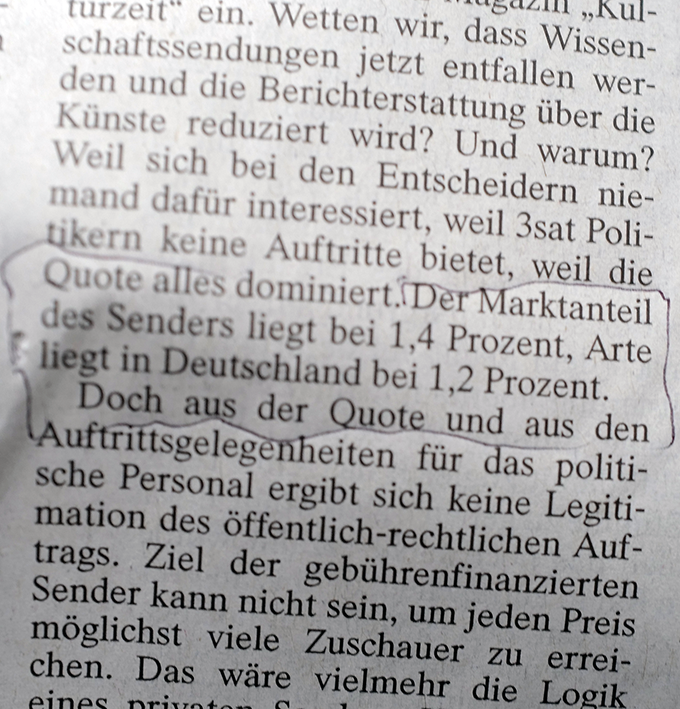 nun ist das, was bisher in den Kulturnischen des FS mitlief, nicht das Gelbe vom Ei. Wo Beliebigkeit, Verdummung als Bürger-Nähe und Kwatscherles mit Ranschmeisser-Tendenz an des Üblichen und was gerade In ist oft zu meiden ist. Aber immerhin war da bisher noch der Anspruch auf Kultur als Teil der demokratischen Öffentlichkeit behauptet, und manchmnal kam auch was anderes durch. Und wenns nur in die Giftschränke später oder versteckter Orte unserer so gern genannten Freiheiten schaffte. Um vielleicht später entdeckt zu werden.
