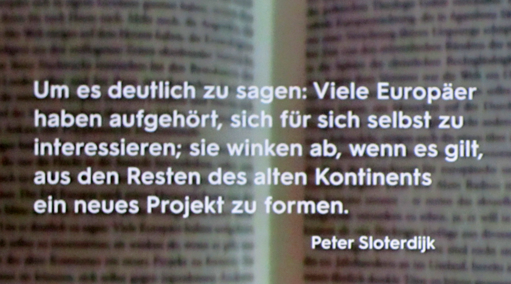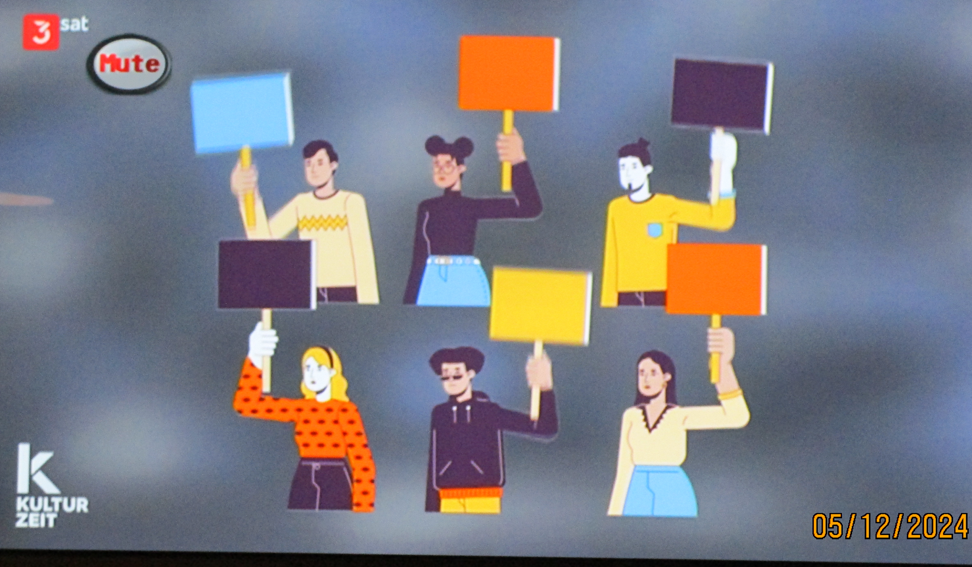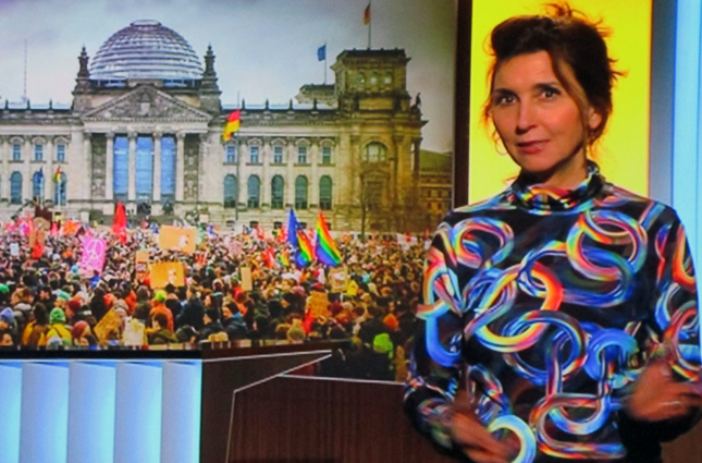Die Ansagerin lobt die bunte Demokratie und warnt vor dem was droht, von allen Seiten, selbst von der Abschaffung beschattet.