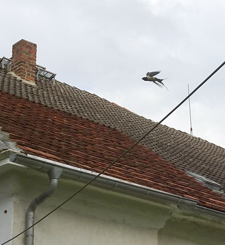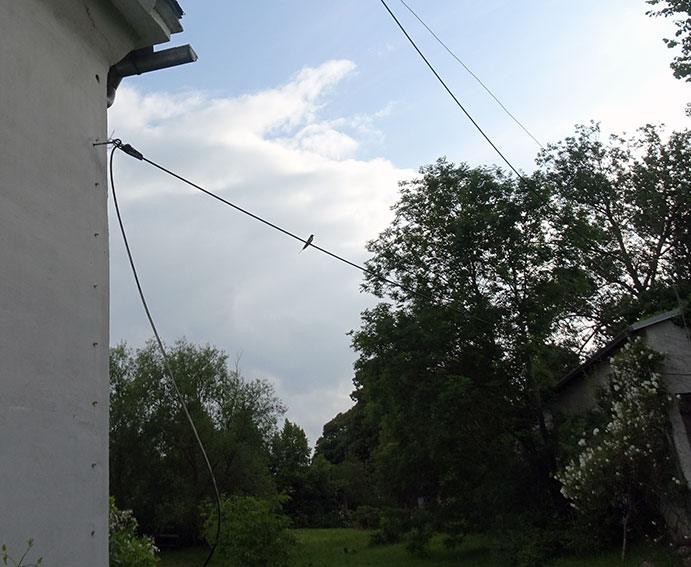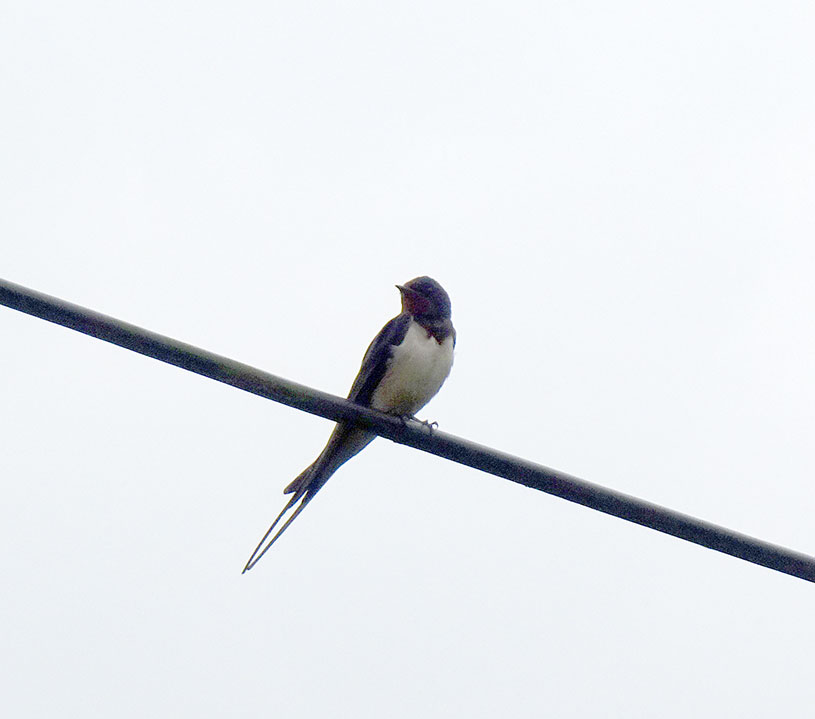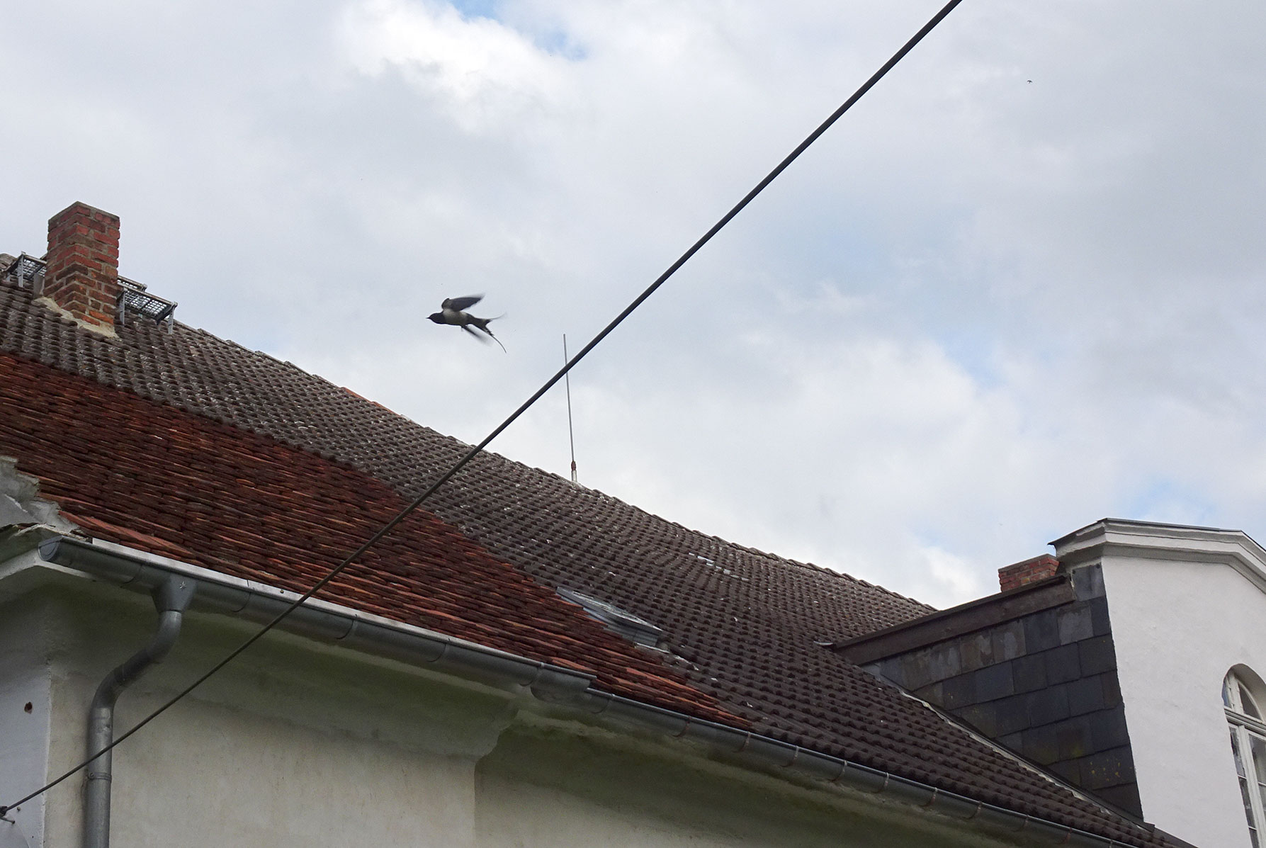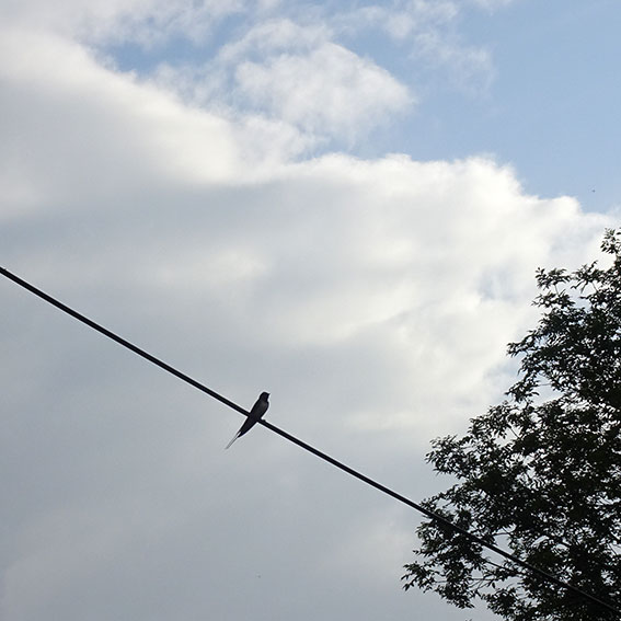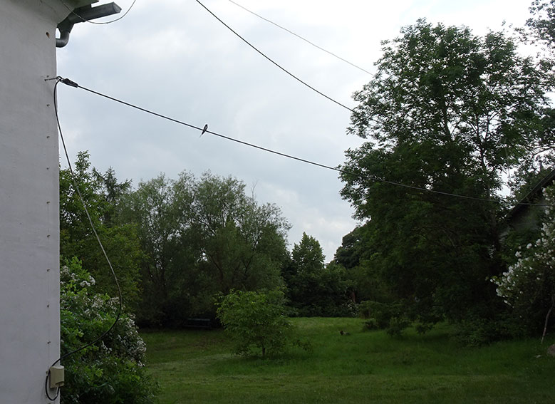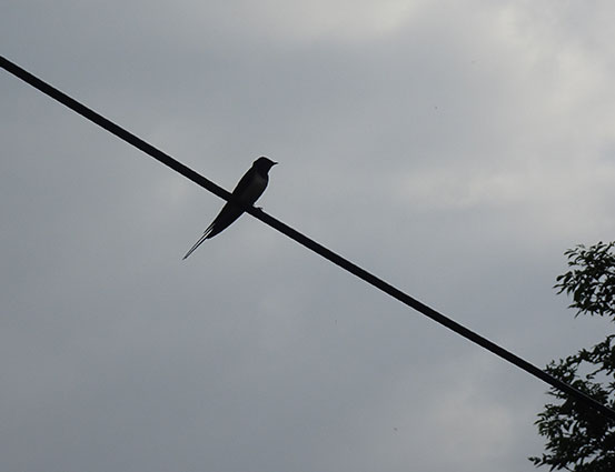 Die Schwalbe sitzend auf der Leitung zum Haus sei uns gegrüsst