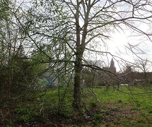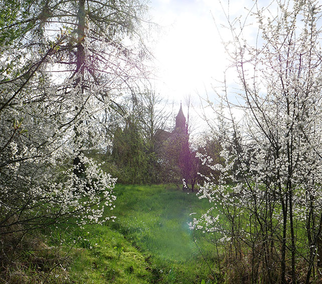Auf dem SWeg nun hierher von der Strasse, wo Kuhstall stand, dürch Schleen das Tor. mit dem Turm der Kirche wieder und Orge auch