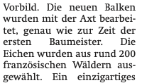Der Vorgabe, alles originalgetreu wiederaufzubauen folgend wurden die 2000 Eichen, die für die Instandsetzung des Dachstuhls gefällt wurden, mit der Hand zurechtgeschlagen. Dazu hat man eigens Werkzeuge nach mittelalterlichem Vorbild angefertigt, damit das Gebälk dieselbe Struktur aufweist wie vor dem Brand.