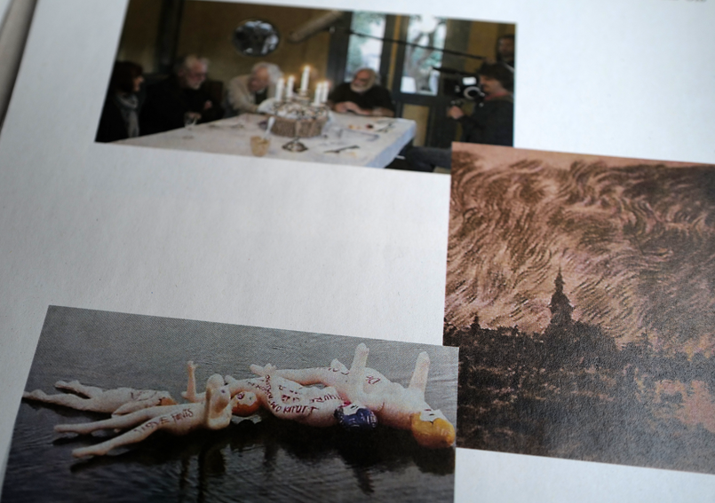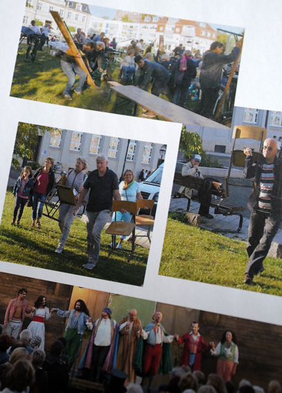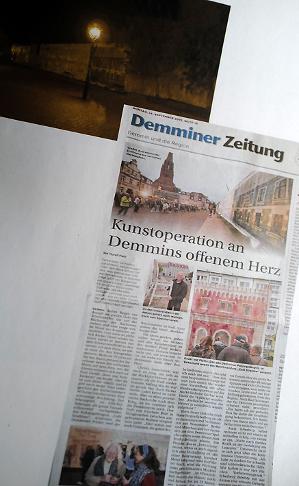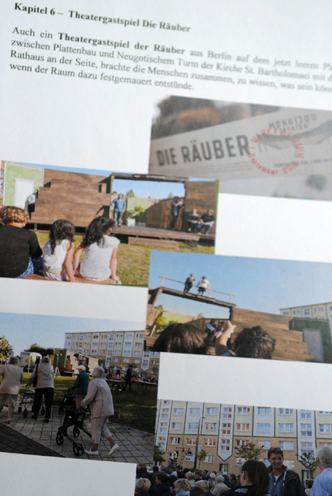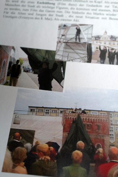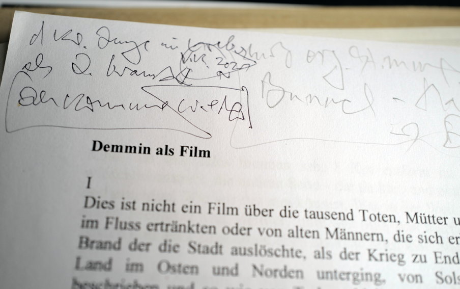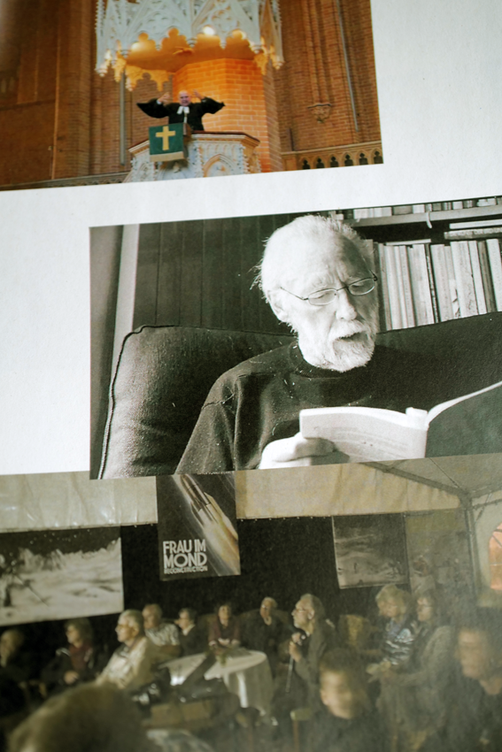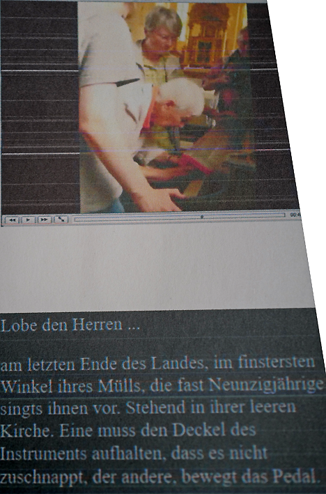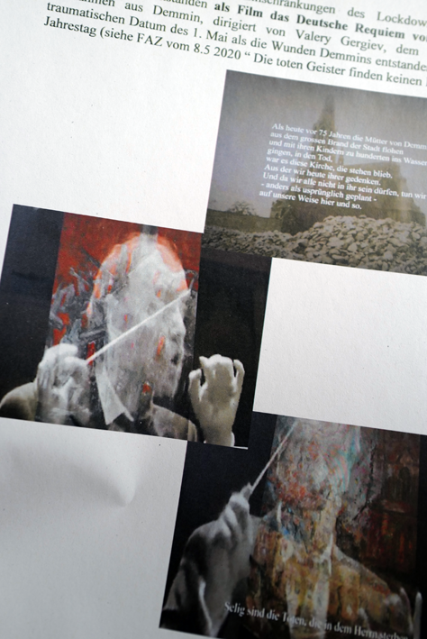 Dazu die Totenbücher der Mütter und Kinder, der Alten hängend in den Bäumen und die Pläne des Aufbaus wieder um sonst und das Theater der Räuber selbst aus Berlin und das Deutsche Requiem von Brahms aus russischer Hand . Am Ende sie am alten Harmonium statt der Orgel vor 45. Singend das Lied zum Lobe Gottes, der uns erfand. 5 Jahre jeden Sommer Demmin nochmal, dann als Film das Ganze zusammen .