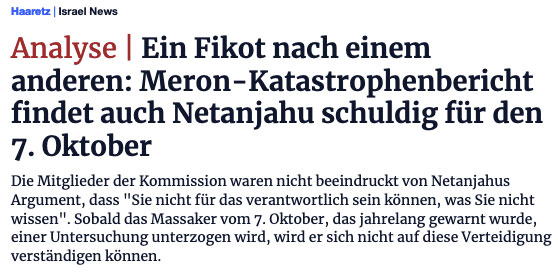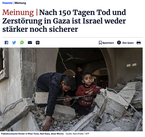 Wir haben die Pflicht, eine Bilanz zu erstellen - "Was hat Israel aus dem Krieg herausbekommen - und uns dann mutig zu fragen: Hätten wir in den Krieg ziehen sollen? Stellen Sie die (gerechtfertigten) Slogans beiseite, wie kein Land einen so grausamen Angriff auf sein Volk übersehen hätte und das Recht eines Landes, sich selbst zu schützen, und was die Menschen wollten, dass Israel es tut. Nach 150 Tagen, in denen es in der Sozialfürsonne in dieser Bilanz nichts gibt, nur hohe Kosten, können wir aus israelischer Sicht an ihrer Weisheit zweifeln.