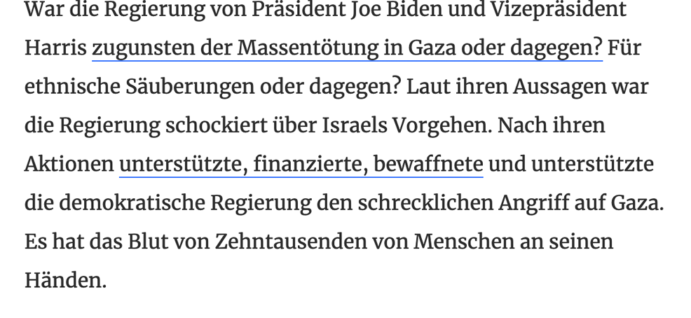 War die Regierung von Präsident Joe Biden und Vizepräsident Harris zugunsten der Massentötung in Gaza oder dagegen? Für ethnische Säuberungen oder dagegen? Laut ihren Aussagen war die Regierung schockiert über Israels Vorgehen. Nach ihren Aktionen unterstützte, finanzierte, bewaffnete und unterstützte die demokratische Regierung den schrecklichen Angriff auf Gaza. Es hat das Blut von Zehntausenden von Menschen an seinen Händen.