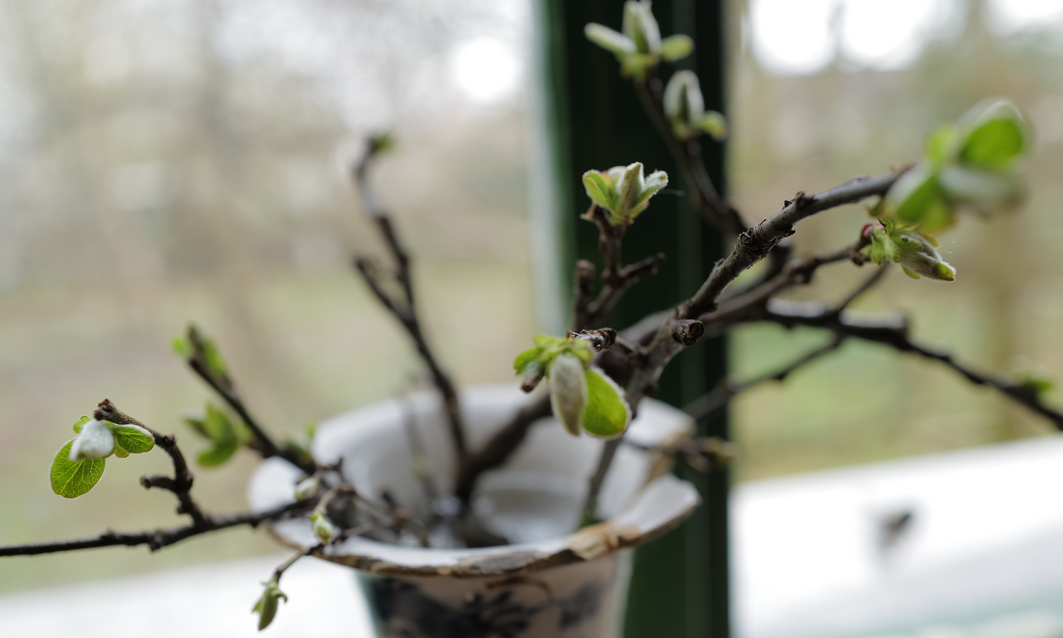 Die Quitte musste geschnitten werden. Zu dicht und mit verminderten Fruchtbestand . Was wegmusste nun hier ins Haus gerettet in die Zimmer als Schutz vor dem eventuellen Nachfrost.