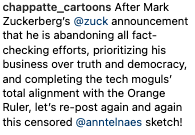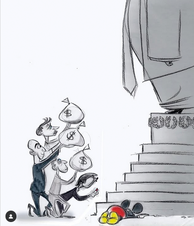 Kürzlich kündigte die renommierte Cartoonistin der „Washington Post“, Ann Telnaes. Zuvor war eine Zeichnung von ihr, die zeigt, wie Amazon-Gründer Jeff Bezos und Zuckerberg mit Geldsäcken vor einer Statue Trumps knien, nicht veröffentlicht worden. Bezos ist seit 2013 Eigentümer der Zeitung.
