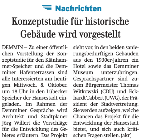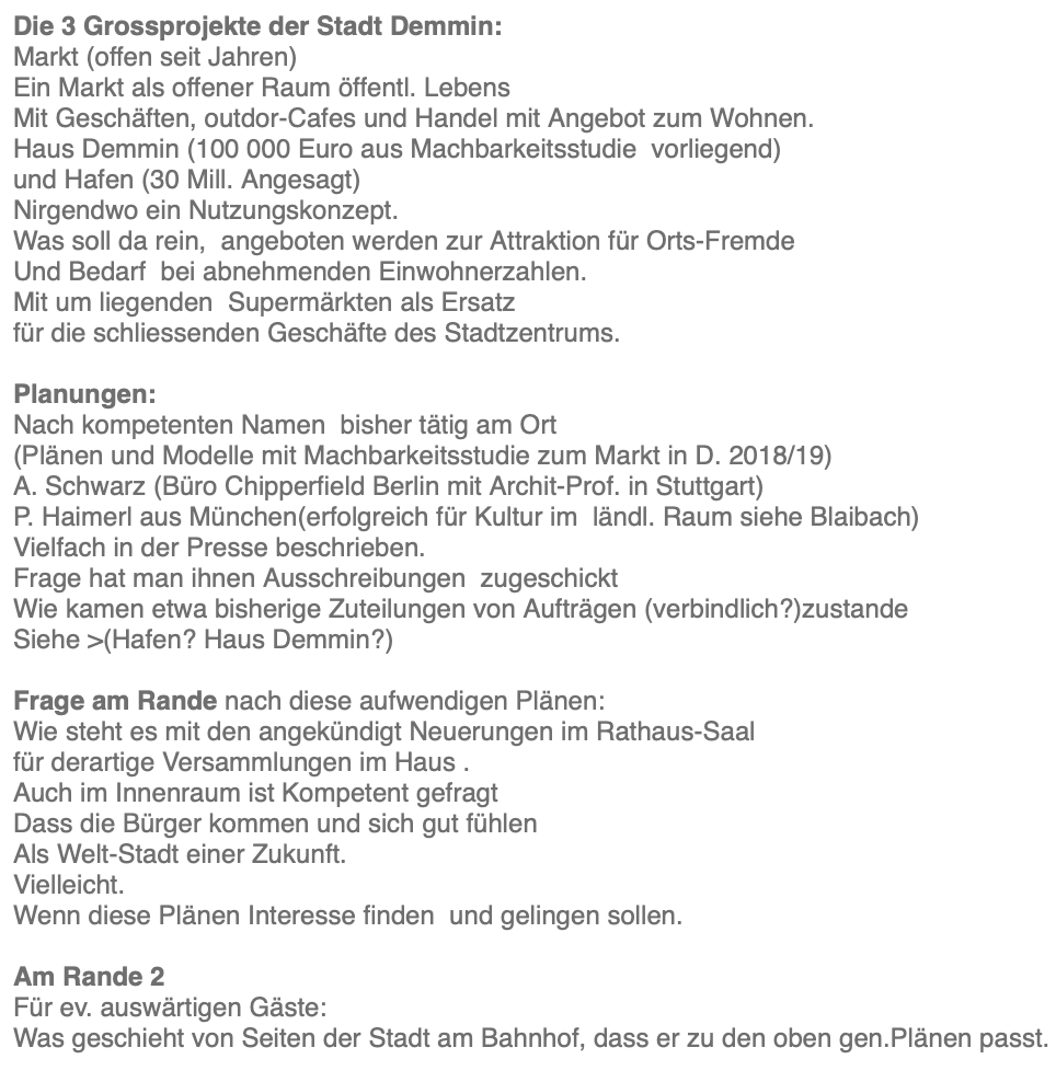 Vor einiger Zeit überlegte die Stadt aus einer eigenen Initiative das historische "Haus Demmin", nun eine Ruinenlandschaft am Rande des Kerns, durch eine aufwendige Machbarkeitsstudie (100 000 Euro) . Ohne weitere Aktivität einer Realisierung bisher.