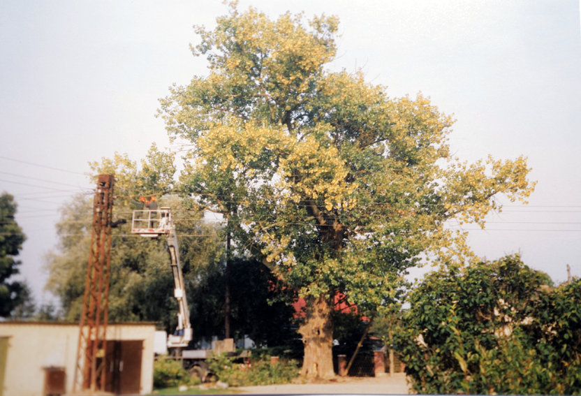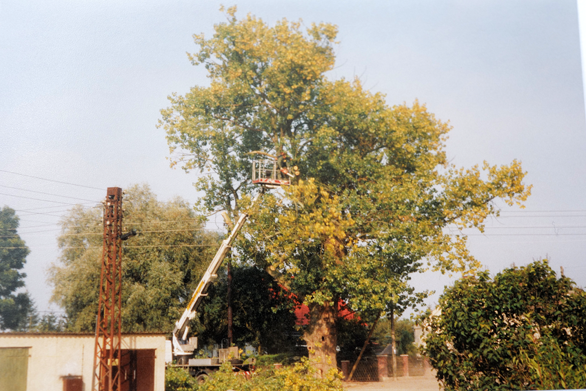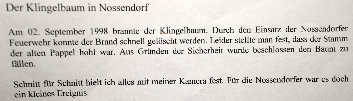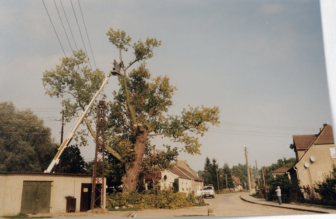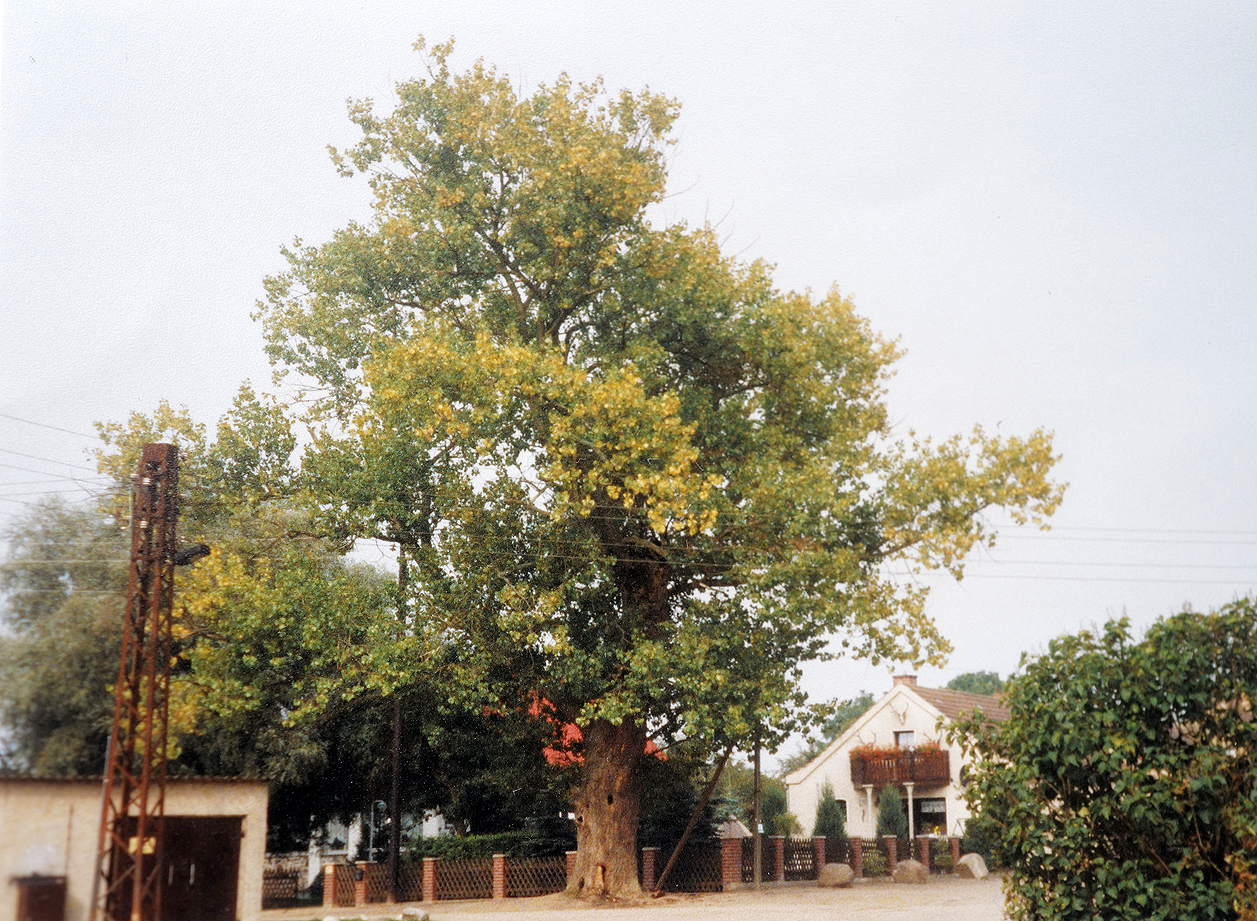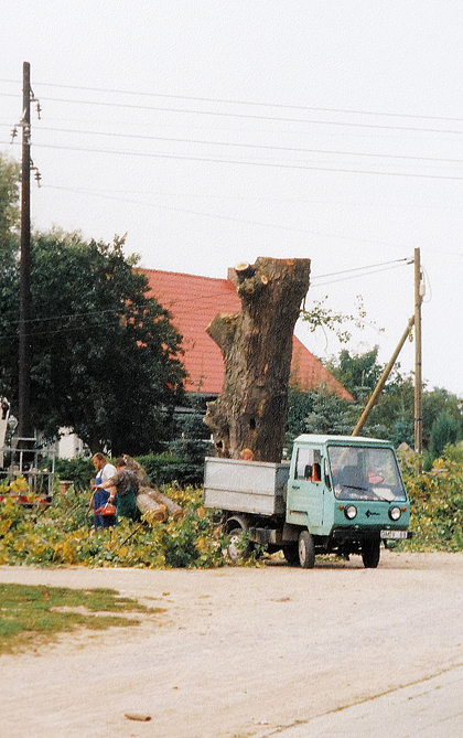 Die Pappel war nach dem Erscheiungsbild wohl eine Eiche. Gesund und kräftig. Bis 1945 am Dorf an den Feldern. Jetzt den neuen Häusern eher zu nahe mit Wurzen, Blättern und Schatten.Oder Umgekehrt die neuen Häuser waren zu nahe herangebaut. 1987 die Freiheit dazu nutzend.