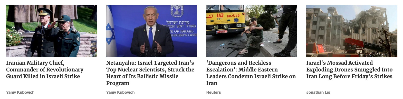 Nach Angaben von Haaretz wurde neben Angriffen aus der Luft auch der Mossad tätig. So erklärt sich wohl der Tod der Miliärrs und Atomwissenschftler, gezielt und in ungeschützten PrivatHäusernWohnungen. Davor. Wer Israel kennt, hätte das wissen müssen.