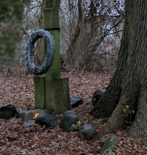 Letzte Zeichnung von Horst Weber, dem Freund , der jetzt am 5. Dezember von uns ging. Wie in jedem Jahr zu Datum der 3 heiligen Könige seine Botschaft. Das Heldengrab ihm zugeordnet, auch im blassen Schwarzblau des Eichenlaubs aus bleiernen Blättern.