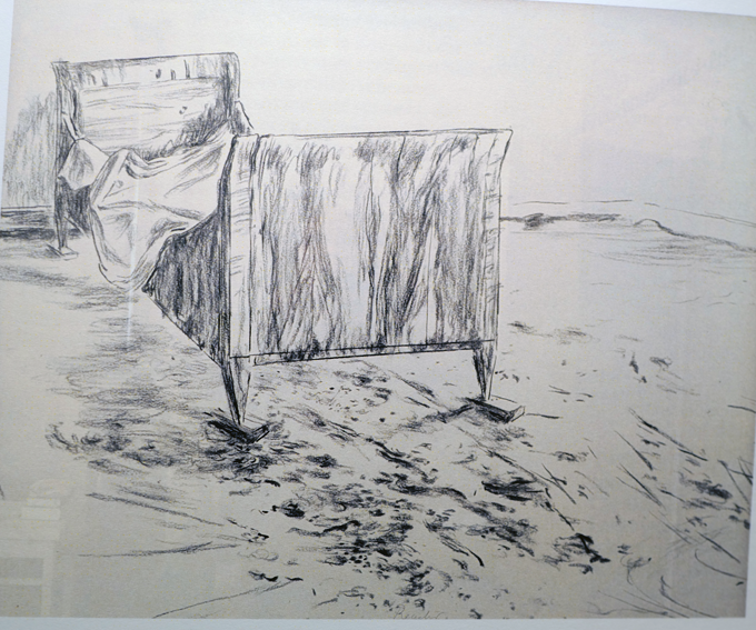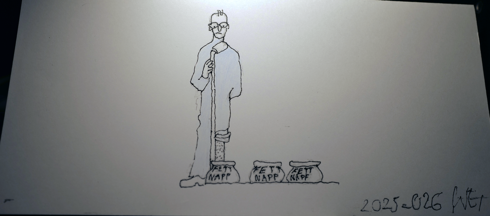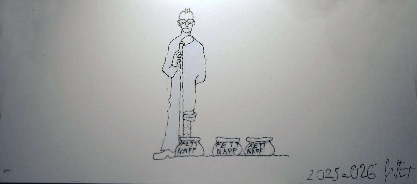 In einem Strich dem letzten, den Einsamen im Fettnapf der Ewigkeit stehend, mit einem Bein hochgekrempelt. Was will er uns sagen. Die andere Hand im Verborgenen.