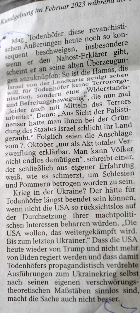 Interessant, wenn hier zum Thema Israel gleich die Oder-Neisse-Grenze einfällt und das deutsche Tabu dazu zustimmen zu müssen, nach unser Geschichte mit Polen. Denn Palästina ist nicht Polen und die Juden, die nach 1945 dort einfielen, waren nicht Verlierer eines Krieges mit den Bewohnern dort.